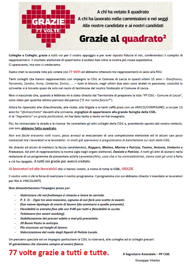Nella Bacheca Sindacale sono stati pubblicati i ringraziamenti della FP CGIL. APRIMI Giuseppe Viterbo